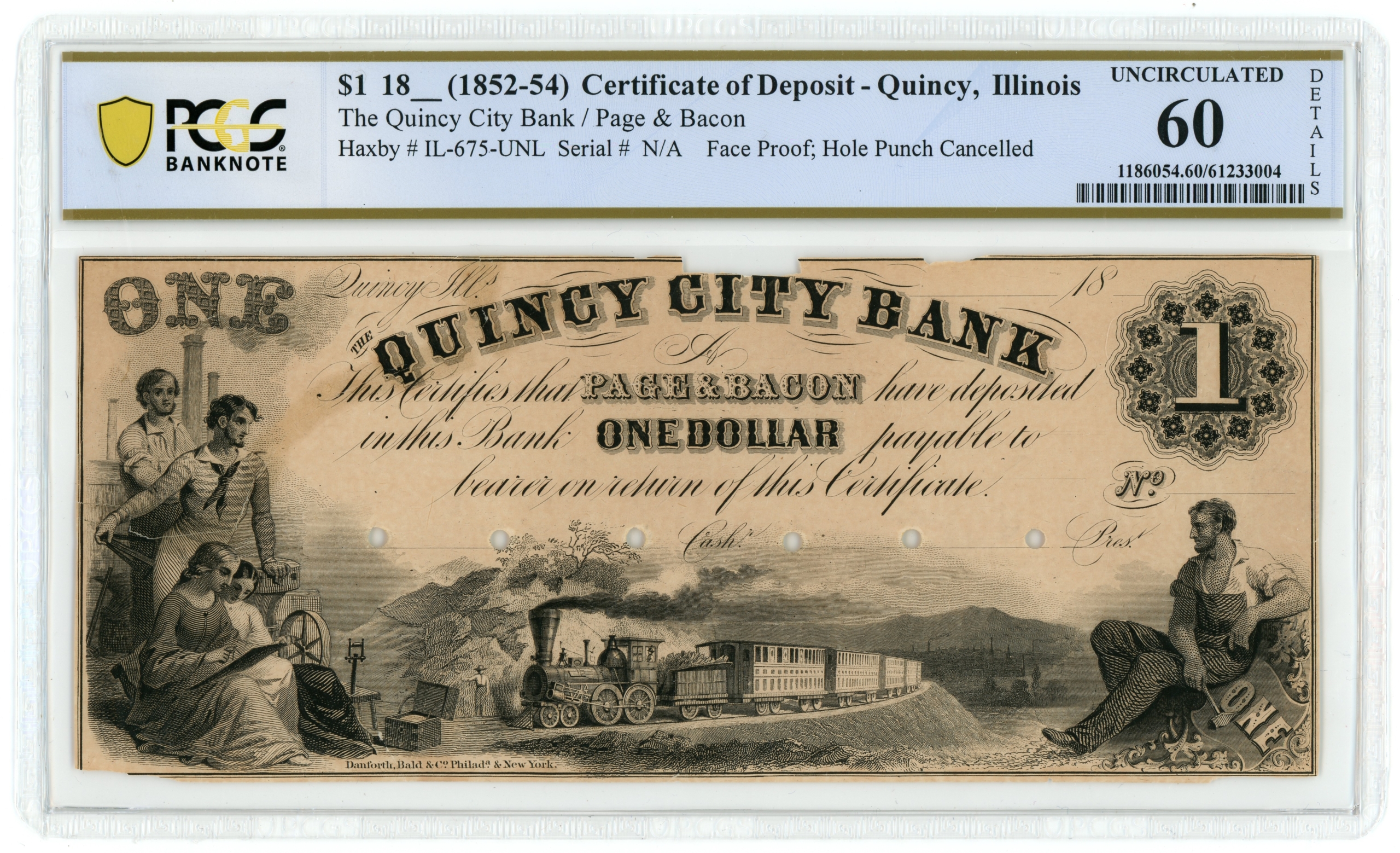 18XX $1 Quincy City Bank page & Bacon IL PCGS UNC60 (L6403)