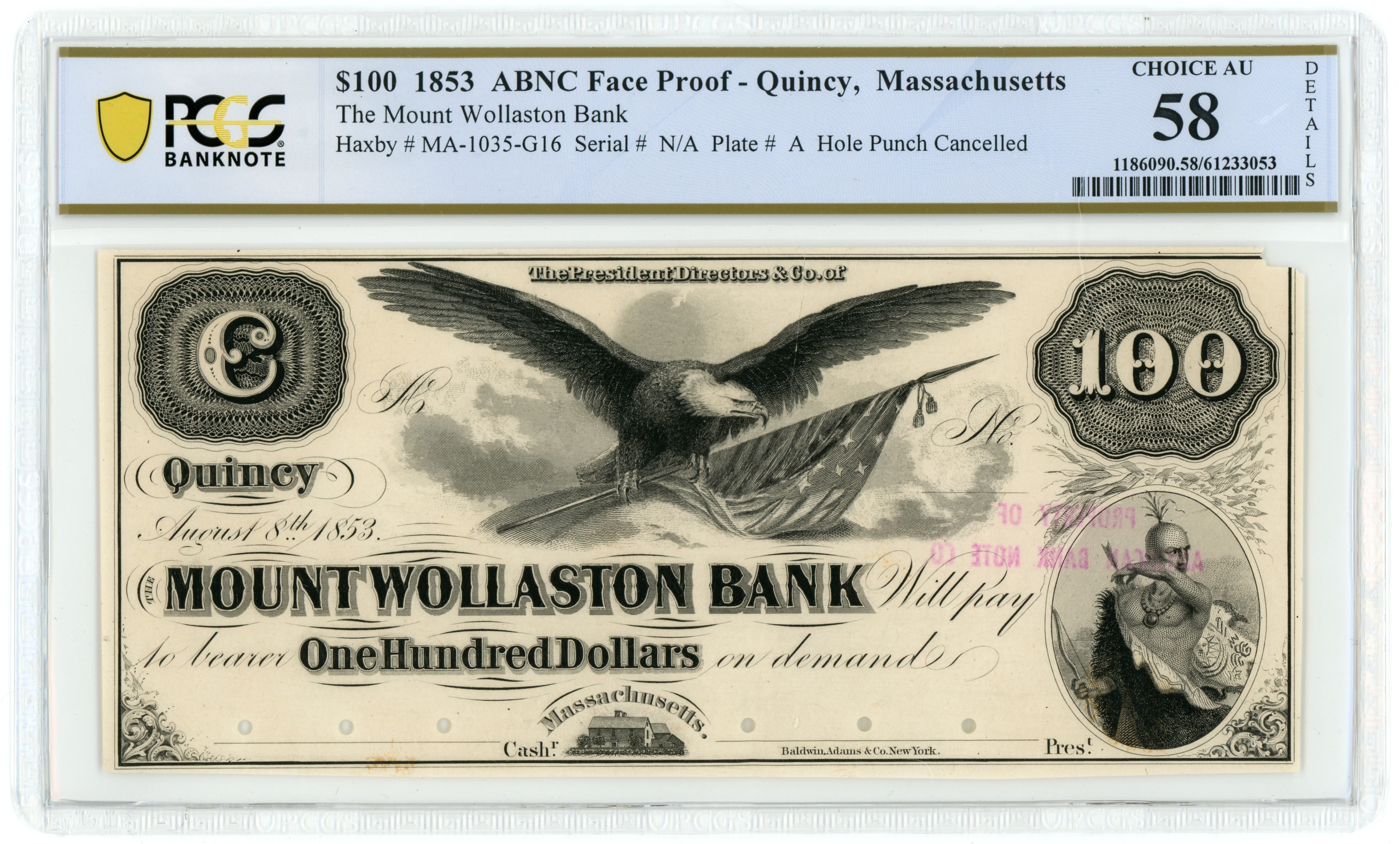 1853 $100 Mount Wollaston Bank Quincy MA PCGS AU58 (L6406)