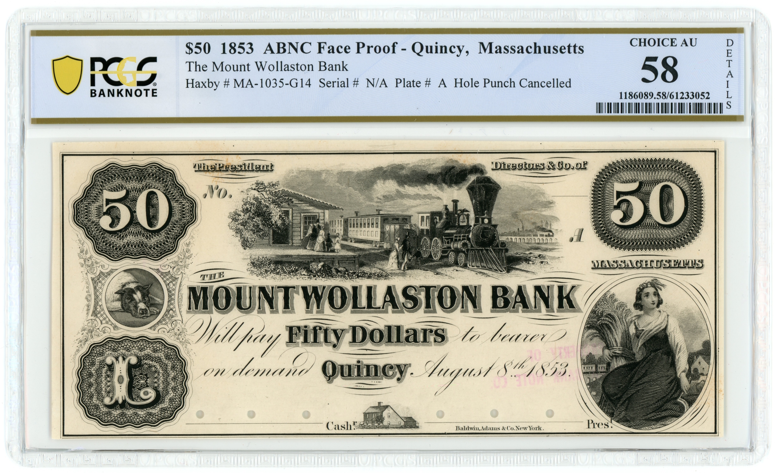 1853 Mount Wollaston Bank $50 Quincy MA PCGS AU58 (L6407)