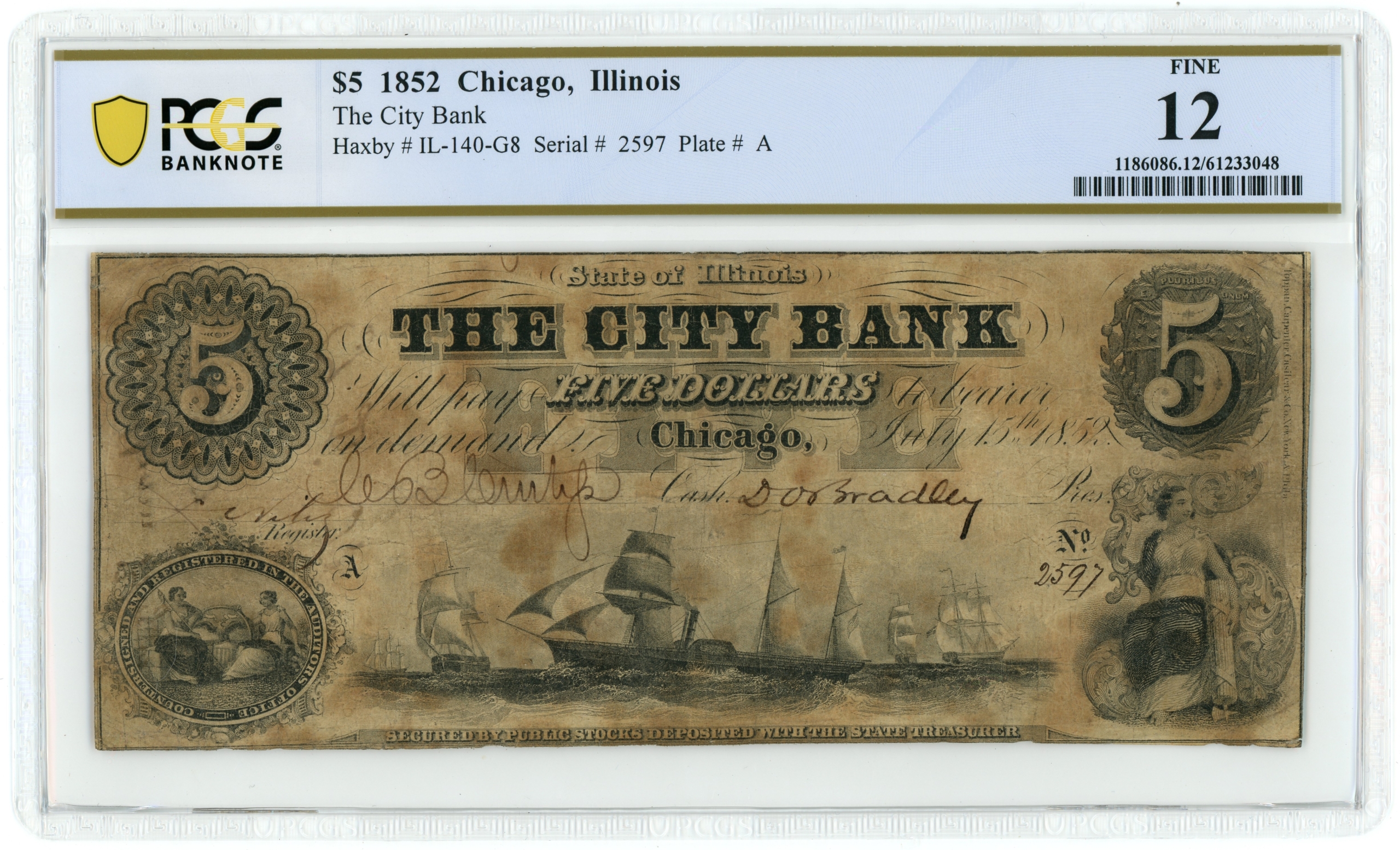 1852 $5 City Bank Chicago Illinois IL PCGS F12 (L6409)