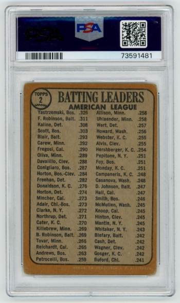 1968 Topps Venezuela #2 AL Batting Leaders Yastrzemski/Robinson/Kaline PSA 2 GD
