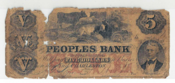 18XX Peoples Bank of South Carolina, Charleston – $5 Note Sh299 R-6 (D05374)