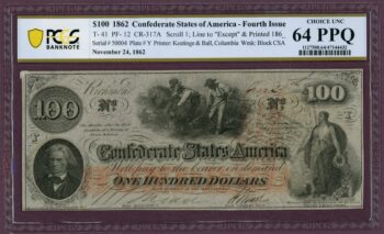 1862 T-41 PF-12 CR-317A Confederate States of America $100 UNC 64 PCGS (L0562)