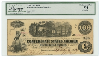 T-40 1862 Confederate States of America CSA $100 PF-1 CR-298 LCG AU55 (65269)