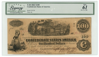 T-40 1862 Confederate States of America CSA $100 PF-1 CR-298 LCG UNC 61 (65271)