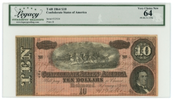 T-68 1864 Confederate States of America CSA $10 Note 2/1 Series PCGS 63PPQ 65087