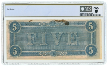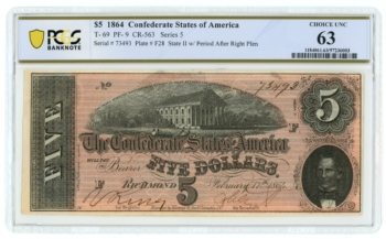 T-69 1864 Confederate States of America CSA $5 Note PCGS UNC 63 GREAT COLOR