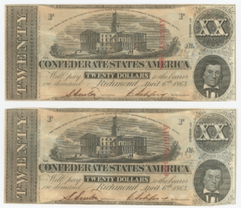 T-58 1863 Confederate States of America CSA $20 Notes 2 Notes in Sequence 64164