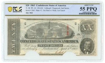 T-58 1863 Confederate States of America CSA $20 Note PCGS AU 55PPQ (65083)