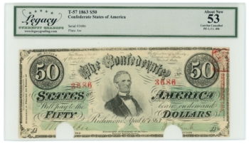 T-57 1863 Confederate States of America CSA $50 PF-1 CR-406 LCG AU53 (65295)