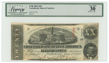 T-58 1863 Confederate States of America CSA $20 PF-21 CR-423 LCG VF30 (65299)