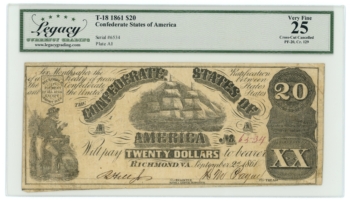 T-18 1861 Confederate States of America CSA $20 PF-20 CR-129 LCG VF25 (65262)