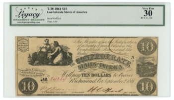 T-28 1861 Confederate States of America CSA $10 PF-9 CR-236 LCG VF30 (65266)