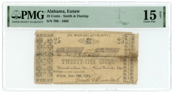 1865 Smith & Dunlap Eutaw Alabama AL 25c Obsolete Scrip R78-UNL PMG 15 NET 65582