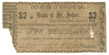 1862 Bank of St Johns Jacksonville FL $2 Obsolete Note B-16 Rarity 6 (65949)