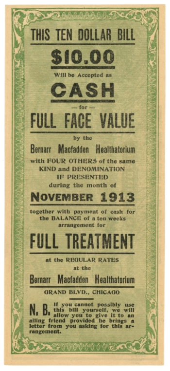 ND CSA Ad note Bernarr Macfadden Healthatorium Chicago IL $10 (L4619)