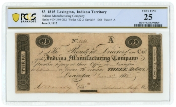 1815 Indiana Manufacturing Co Lexington Indiana Territory $3 Obsolete (65187)