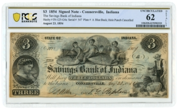 1854 Savings Bank of Indiana Connersville IN $3 Obsolete PCGS 62 Details (65731)