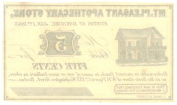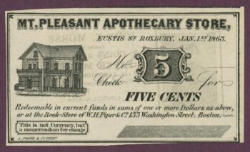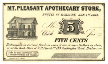 1863 Mt. Pleasant Apothecary Store, Boston, Massachusetts 5c Scrip M500 (59956)