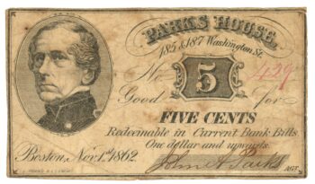 1862 Parks House, Boston, Massachusetts 5c Obsolete Scrip No.429 UNL (59955)