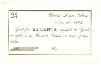 1862 Wendell Depot, Massachusetts 25c Obsolete Scrip (59960)