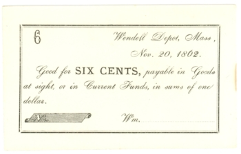 1862 Wendell Depot, Massachusetts 6c Obsolete Scrip (63330)