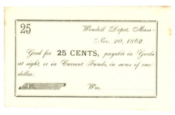 1862 Wendell Depot, Massachusetts 25c Obsolete Scrip (63395)