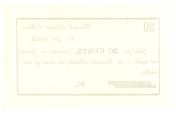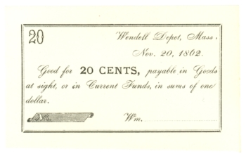 1862 Wendell Depot, Massachusetts 20c Obsolete Scrip (63394)