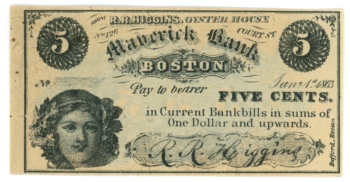 1863 R.R. Higgins, Maverick Bank, Boston, Massachusetts 5c Obsolete Note (63634)