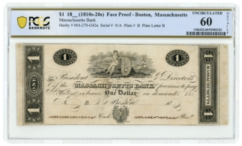1810s-20s Massachusetts Bank MA $1 Proof PCGS UNC 60 Details Abner Reed (65671)