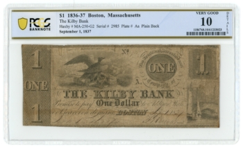 1837 Kilby Bank Boston MA $1 Obsolete Note PCGS 10 Details MA250-G2 (65703)