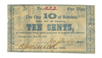 1862 City of Natchez Mississippi 10 Cents MS (L6612)