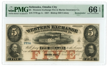 1857 Omaha City Nebraska $5 Western Exch. Fire & Ins. Co. PMG 66EPQ (L6316)