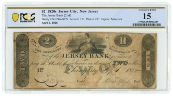 1826 Jersey Bank – Jersey City NJ $2 Obsolete PCGS 15 NJ246-G12a W-939 (65710)