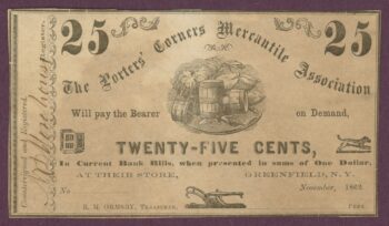 1862 Porters’ Corners Mercantile Association, Greenfield, NY 25c Note (60628)