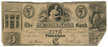 1853 Mechanics Bank, Philadelphia, Pennsylvania $5 Obsolete Note CTFT (62824)