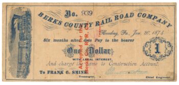 1874 Berks County Rail Road Co., Reading, Pennsylvania $1 Note No.939 (59989)