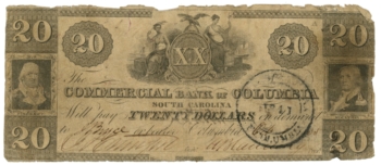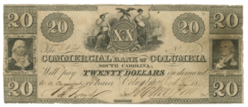 1835 Commercial Bank of Columbia, South Carolina $20 Obsolete Note Sh142 (62800)