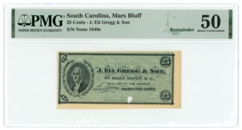 1840s J Eli Gregg & Son Mars Bluff South Carolina SC 25c Obsolete Sh1024 PMG 50