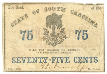 1863 Bank of the State of South Carolina, Charleston SC 75c Note (63531)