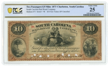 1873 South Carolina Railroad Company Charleston SC $10 PCGS VF25 Sh673 (65738)