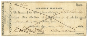 1862 Treasury Warrant Austin Texas $10 TX (L4176)