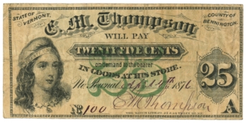1876 E.M. Thompson, County of Bennington, Pownal, Vermont 25c Scrip (59833)