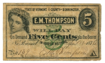 1876 E.M. Thompson, Bennington County, Vermont 5c Obsolete Scrip No.139 (62136)