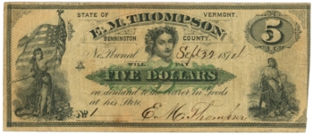 1874 E.M. Thompson Vermont $5 VT No.1 (L4158)