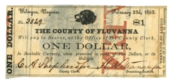 1863 County of Fluvanna Palmyra Virginia VA $1 Obsolete Scrip (65061)