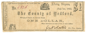1862 County of Bedford Liberty VA $1 Obsolete Scrip – Civil War Era (65374)