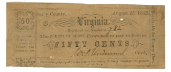 1862 County of Surry Virginia VA 50c Obsolete Scrip – Civil War Era (65373)