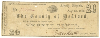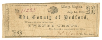 1862 County of Bedford, Liberty, Virginia 20c Obsolete Note No.11223 (62147)