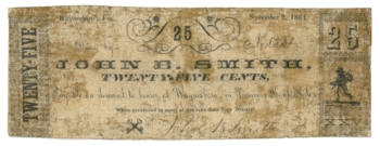 1861 John B Smith Waynesboro Virginia VA 25c Obsolete Scrip Civil War Era 64755
